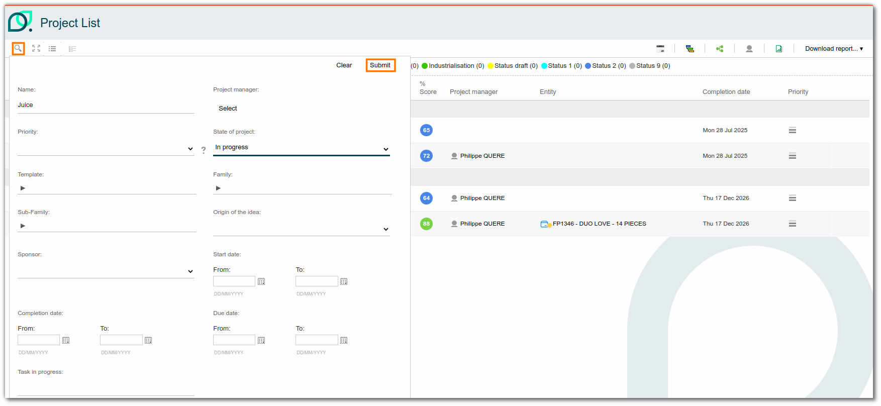 The advanced search allows you to display all the projects or to filter according to specific criteria. Customized exports can be configured as required. See online documentation.