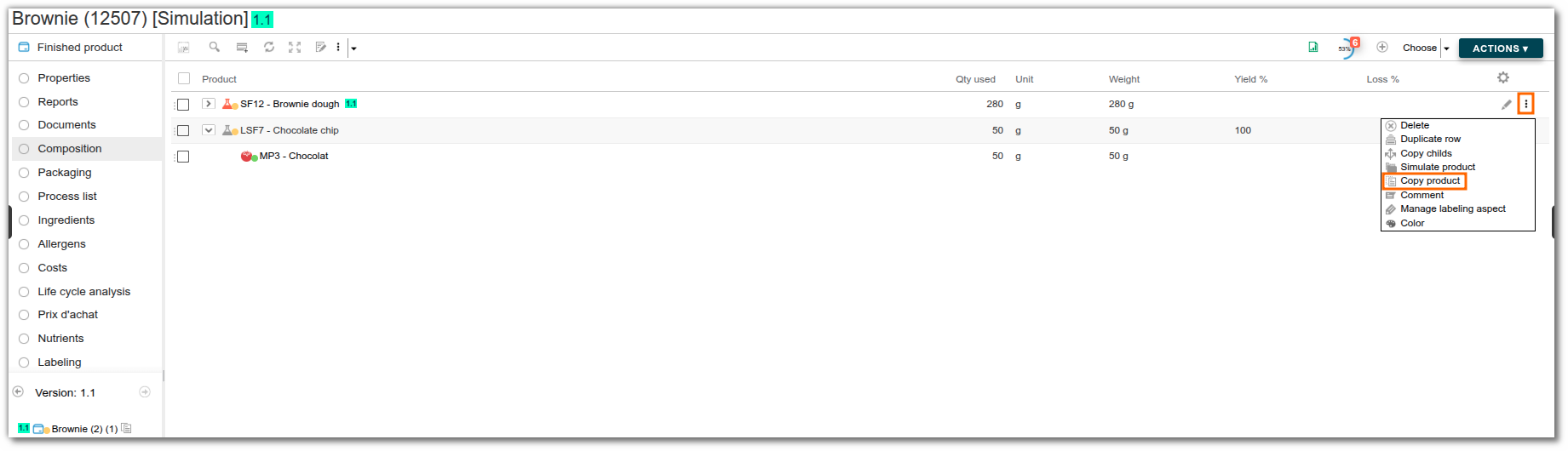 The "Copy product" tool allows you to duplicate a product directly from the "composition" list. This feature is useful for testing a new formulation of a semi-finished product or raw material independently of the original product.The copy automatically replaces the original component in the composition.