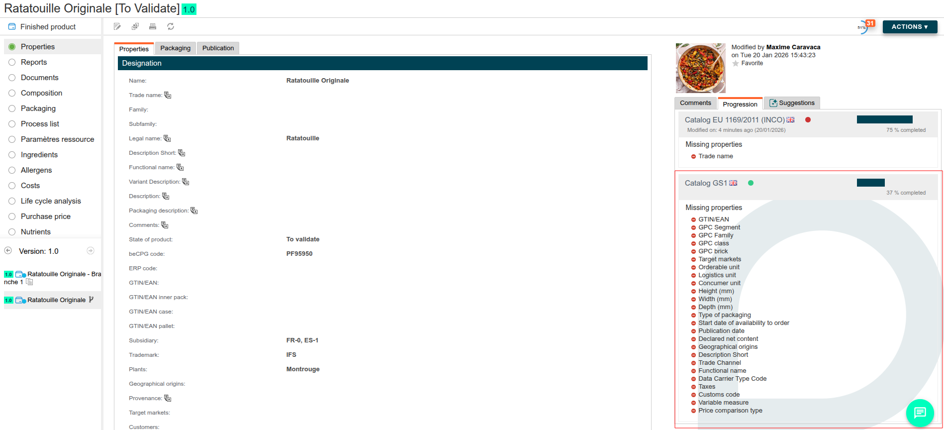 La complétion des champs GS1 est suivie dans un catalogue "GS1" dédié, disponible depuis l'onglet "Progression" sur le produit.